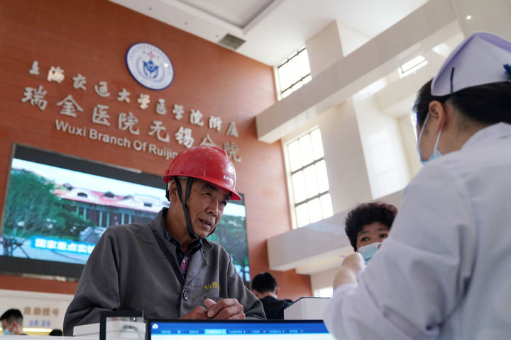 在位于江苏省无锡市的上海交通大学医学院附属瑞金医院无锡分院,就诊者在服务台咨询(5月18日摄)。新华社记者 马宁 摄