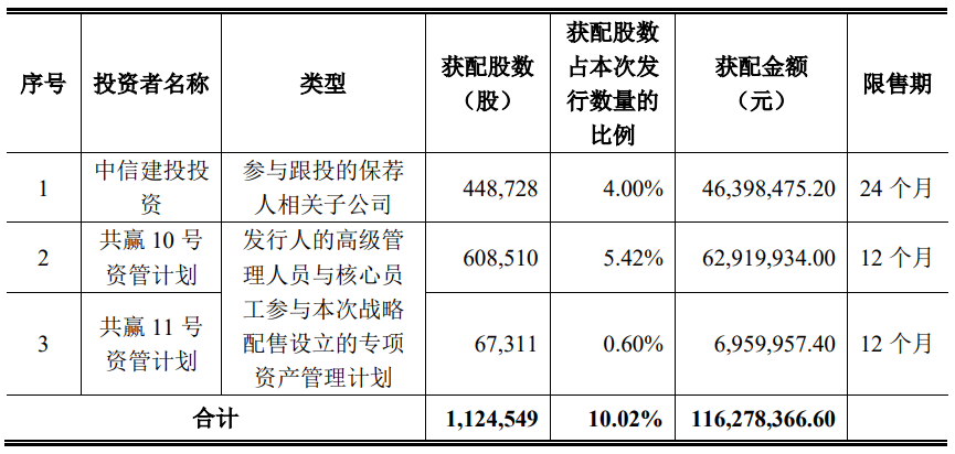 浩辰软件本次发行的战略配售由保荐人相关子公司跟投、发行人高级管理人员与核心员工参与本次战略配售设立的专项资产管理计划组成?其中,跟投机构为中信建投投资有限公司(简称“中信建投投资”),中信建投投资跟投比例为本次公开发行股票数量的4.00%,实际跟投股数为448,728股,获配金额为46,398,475.20元。