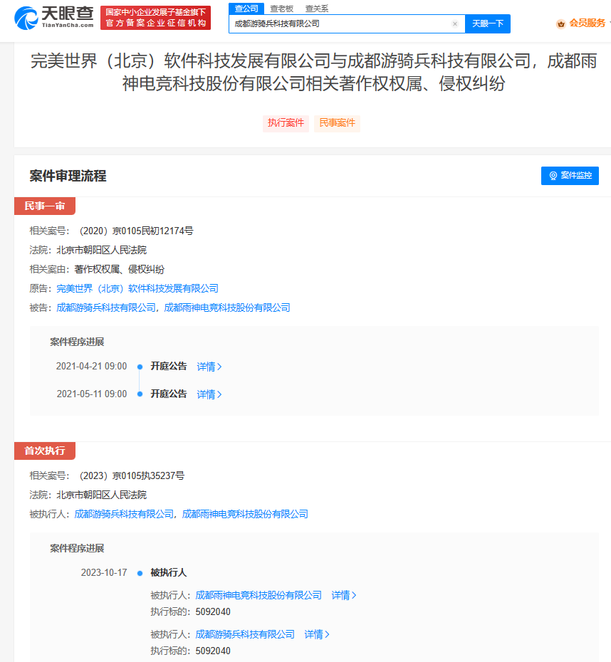 (记者 安青)据天眼查App显示,近日,成都雨神电竞科技股份有限公司及子公司成都游骑兵科技有限公司新增一则被执行人信息,执行标的509万余元,涉及完美世界(北京)软件科技发展有限公司与上述两公司相关著作权权属、侵权纠纷案件,执行法院为北京市朝阳区人民法院。