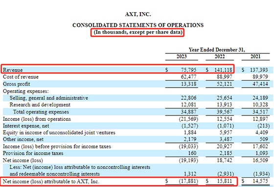 从业绩来看,东方财富显示,AXT 2023年营业收入大幅下降,其归母净利润也由盈转亏。具体为,AXT营业收入由1.41亿美元降至7579.5万美元,下降46.29%;AXT归母净利润由盈利1581.1万美元变为亏损1788.1万美元。关于业绩下降的原因,AXT在公告中表示,主要是需求下降导致。
