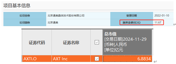 另外,北京通美注册稿披露日为2022年8月1日。东方财富显示,彼时AXT的总市值为26.76亿元。即AXT在2024年11月29日的市值相较2022年8月1日时缩水74.29%。