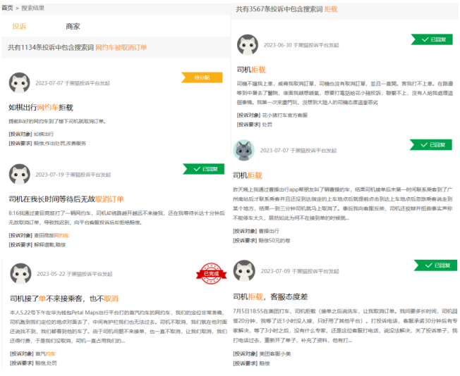 中国网记者发现,黑猫投诉平台上关于网约车司机拒载、取消订单的投诉量达上千条。