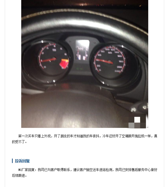 同时,记者通过相关投诉平台发现,关于名爵5发动机抖动异响的投诉大面积存在,且发动机抖动引起车身剧烈抖动,多数车主强调该情况普遍出现在车辆怠速时,部分车主反映开空调时抖动加剧:“开了空调跟开拖拉机一样,真的受不了。”
