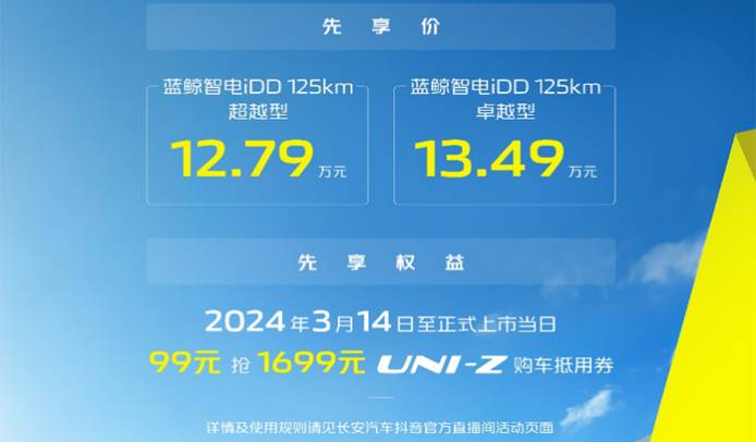 而12.79-13.49万的先享价不仅刷新了新能源市场的价格体系,更引领混动SUV快速迈向智电时代。值更劲爆的是,长安UNI-Z还为用户提供了专属先享权益:自2024年3月14日起至正式上市之日,仅需99元即可抢得价值1699元的UNI-Z购车抵用券,让用户提前享受购车优惠,尽情感受新一代智混SUV长安UNI-Z带来的智电魅力。