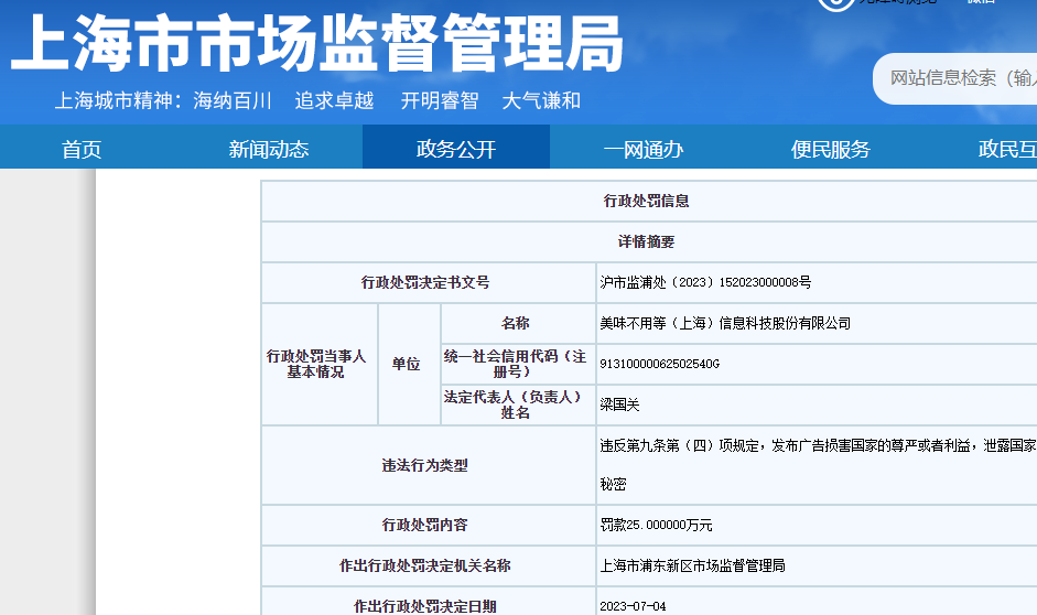 (记者 郭帅)日前,美味不用等(上海)信息科技股份有限公司因“发布广告损害国家的尊严或者利益,泄露国家秘密”违反广告法相关规定,被上海市浦东新区市场监督管理局罚款25万元。