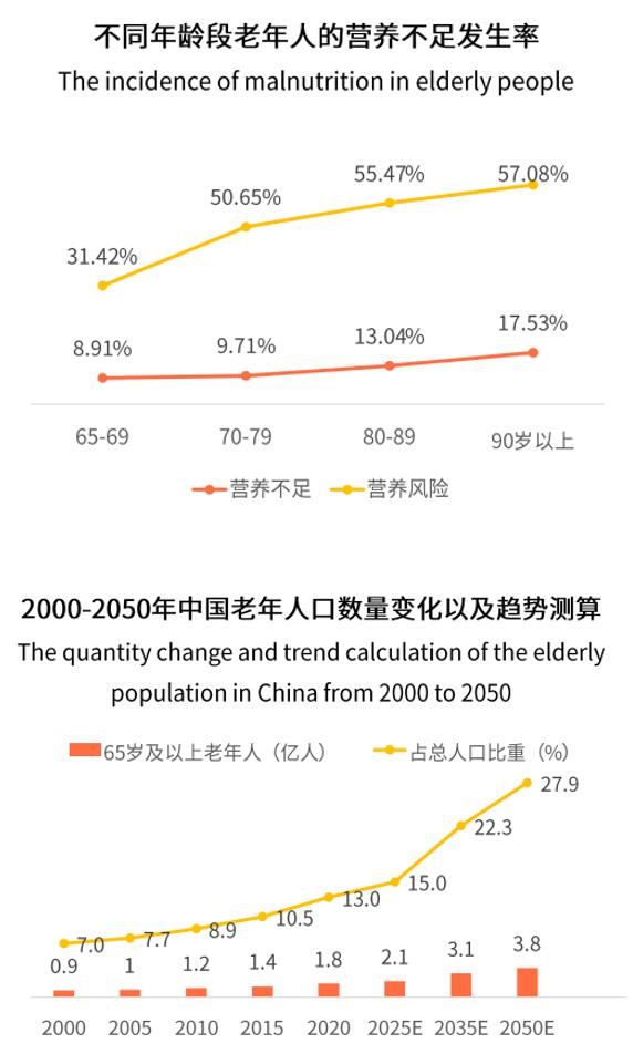 从老年人的身体状况来看,随着年龄增长,器官功能逐渐衰退,咀嚼能力、消化吸收能力包括感官反应指征下降,导致他们摄取、消化、吸收食物的能力下降,所以从食物中获取营养物质的数量和质量也都在下降,非常容易发生营养不良。另外,很多人老年人有基础慢性病,比如糖尿病、高血压高血脂、心脏病、心脑血管疾病等,这些基础性的慢性病,也会加大人体对营养的需求。其次,老年人的慢性病基本上活到老药吃到老,而许多慢性病的常见药物在服用的同时,也会加快体内一些营养素的流失。