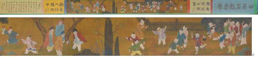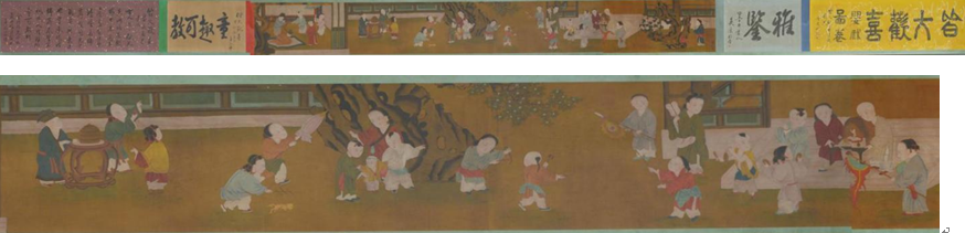 旧传为唐代画家张萱(活跃于 8 世纪,京兆人,擅仕女、婴儿题材)。这幅画以赭黄为底,色彩浓丽明快,是典型的工笔重彩婴戏题材。