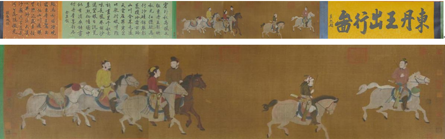 趙孟頫:元代初年(1254—1322),宋太祖十一世孙(宋朝宗室),入元为官,书画领袖。此画描绘东丹王耶律倍率众出行的场景。