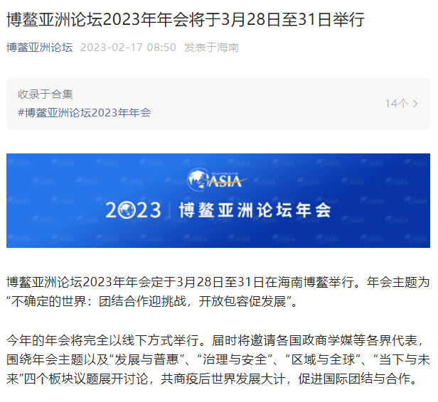 博鳌亚洲论坛2023年年会定于3月28日至31日在海南博鳌举行。年会主题为“不确定的世界:团结合作迎挑战,开放包容促发展”。[详细]