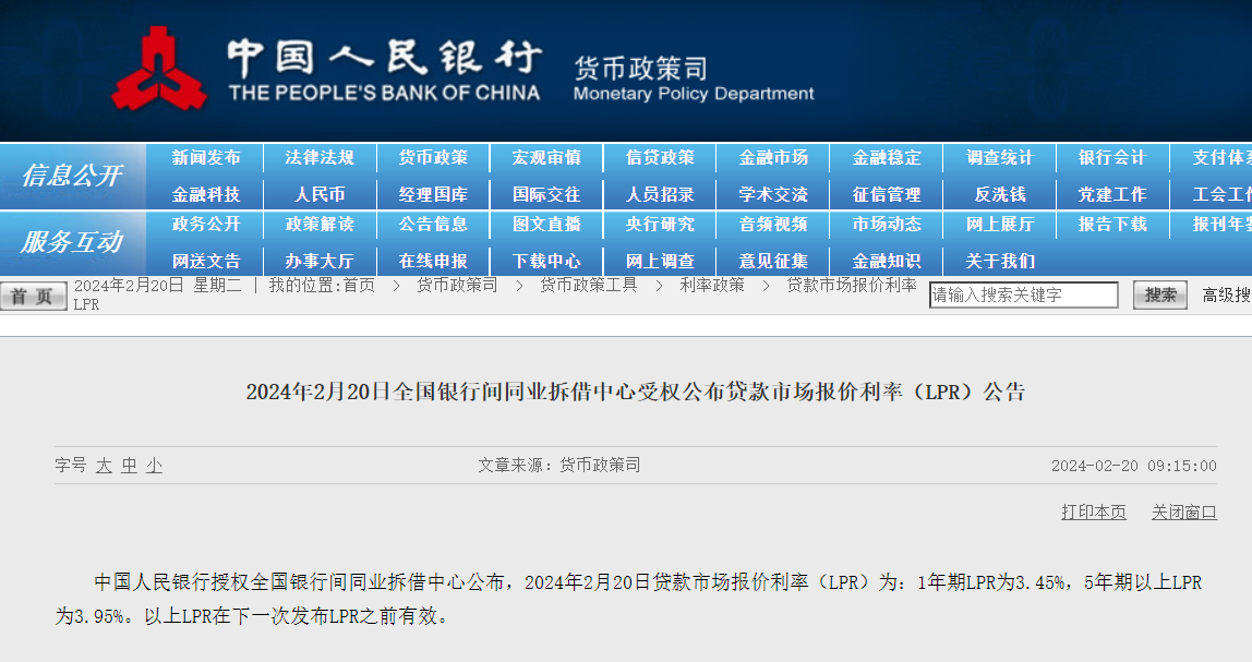 2月20日,中国人民银行授权全国银行间同业拆借中心公布最新一期贷款市场报价利率(LPR):1年期LPR为3.45%,5年期以上LPR为3.95%。